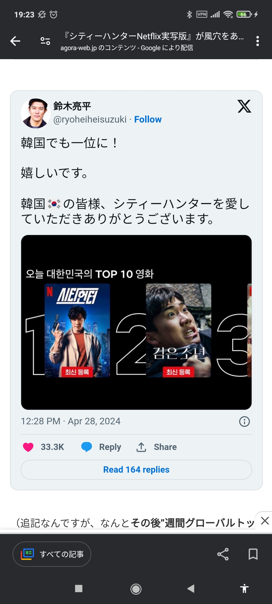 「シティーハンター」Netflix週間グローバルTOP10で初登場1位