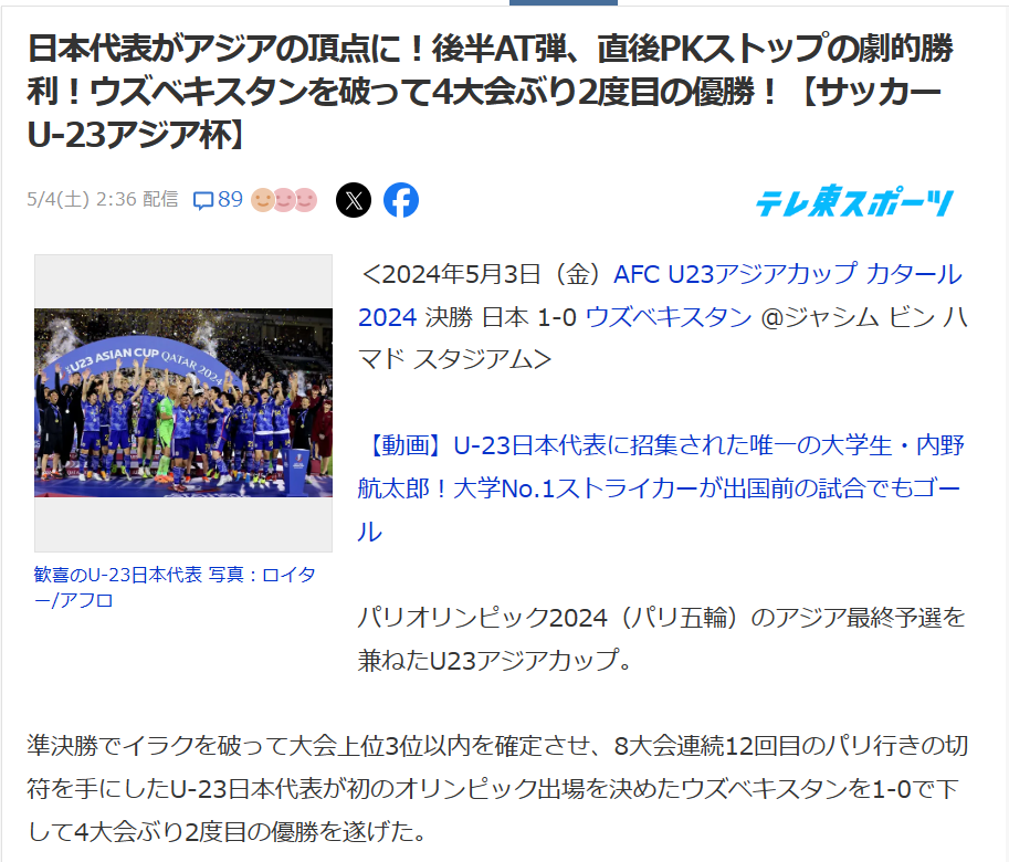 準決勝でイラクを破って大会上位3位以内を確定させ、8大会連続12回目のパリ行きの切符を手にしたU-23日本代表が初のオリンピック出場を決めたウズベキスタンを1-0で下して4大会ぶり2度目の優勝を遂げた。
