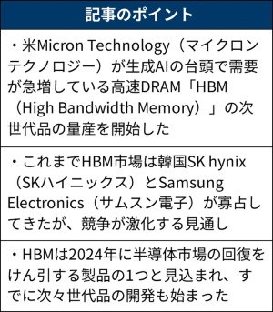 生成AI(人工知能)の台頭で需要が急増している高速DRAM「HBM(High Bandwidth Memory)」をめぐり、米Micron Technology(マイクロンテクノロジー)が先行する韓国SK hynix(SKハイニックス)と韓国Samsung Electronics(サムスン電子)を猛追している。HBMの次世代品「HBM3E(3e)」型の量産を始めたと2024年2月26日(米国時間)に発表した。同年上期中の量産開始を予定するサムスン電子に先行した形だ。HBMはこれまで韓国勢が市場シェアを2分してきたが、HBM3E型の浸透を境にマイクロンがシェアを伸ばす可能性がある。