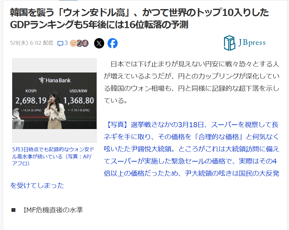 4月29日、円ドル相場が1ドル=160円台に達すると、韓国の外国為替市場ではウォンの対ドルの為替レートが一時1400ウォンを突破し、1年6カ月ぶりの最安値を記録した。経済専門家の間ではウォンの為替レートが1400ウォンを突破し1600ウォンまでドル高が進むとの見通しも出ており、目下、韓国経済はこのウォン安ドル高に加えて原油高、物価高の「三重苦」に襲われている。