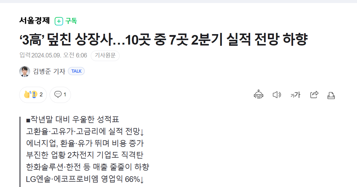 ウォン·ドル為替レートが1ドル当り1350ウォンを越える高為替レートと原油価格上昇で証券会社が70%を越える上場会社の第2四半期実績展望を下方修正した。 ウォン安ドル高によって為替差益を得る企業も一部あったが、大多数が原材料·副材料価格の上昇による為替損失が避けられないと見たのだ。 米国の大統領選挙とあいまって、各国が電気自動車の支援を縮小し、国内の2次電池企業に直撃弾になるなど、政治イベントも企業の経営難を増大させている。 金融投資業界では、個別企業の業績発表に注目する必要があると助言した。