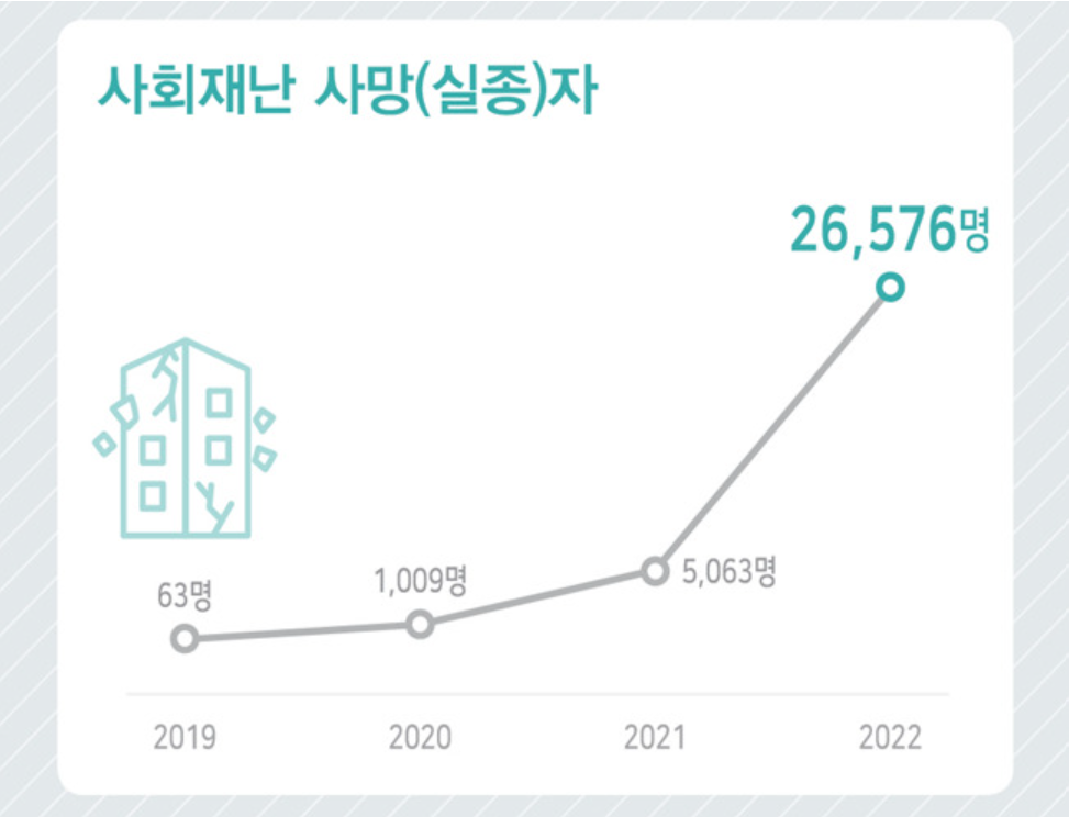 22年の社会災難死亡(行方不明)者は2万6576人で、前年(5063人)比5倍規模に増加した。 負傷者も453人で、前年(50人)より9倍規模に拡大した。>>62
