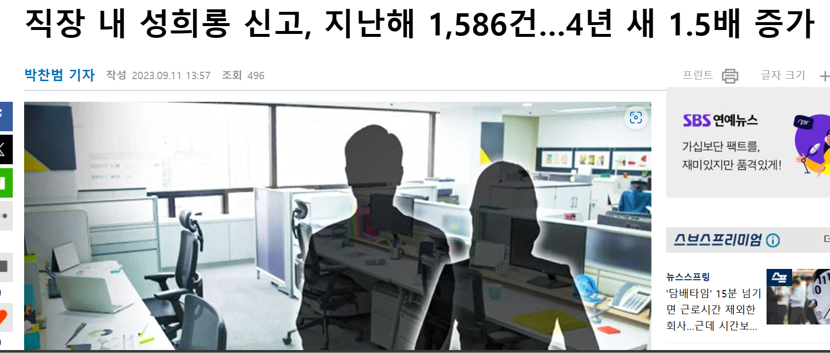 職場内セクハラ申告、昨年1,586件···4年間で1.5倍増加