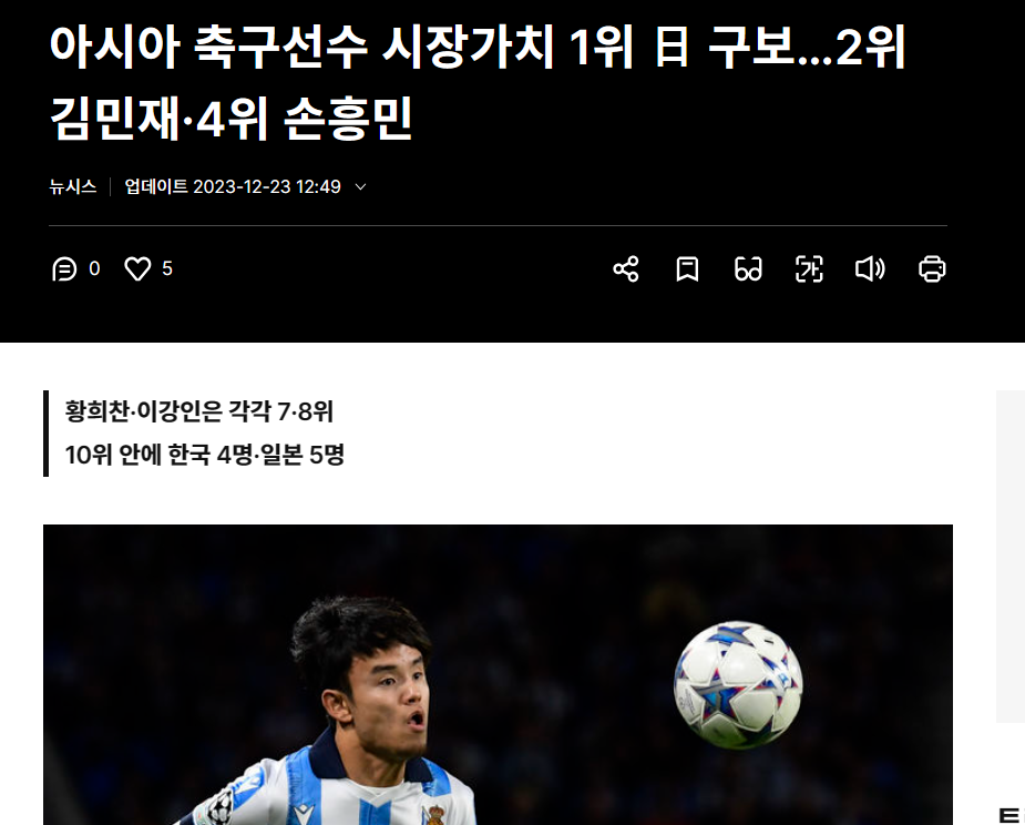 アジアのサッカー選手、市場価値1位の久保···2位キム·ミンジェ、4位ソン·フンミン