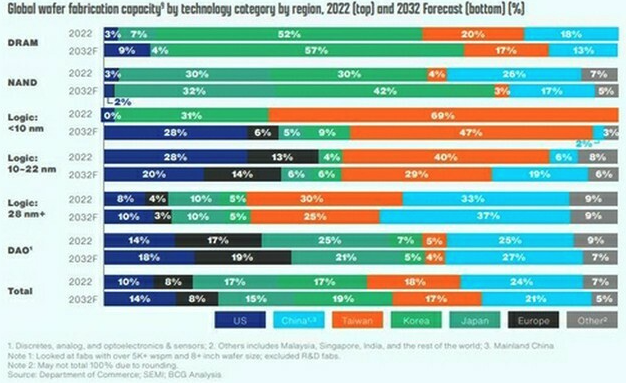 2032년 세계 반도체 생산능력에서 차지하는 한국 비율은 19%로 확대돼 대만(17%)을 빼고 중국(21%)에 이어 2위에 올 것으로 예상된다. 업계 단체인 미국 반도체 공업회(SIA)와 미국 컨설팅 대기업인 보스턴 컨설팅 그룹(BCG)이 8일 반도체 공급망(공급망)에 관한 보고서를 공표했다.