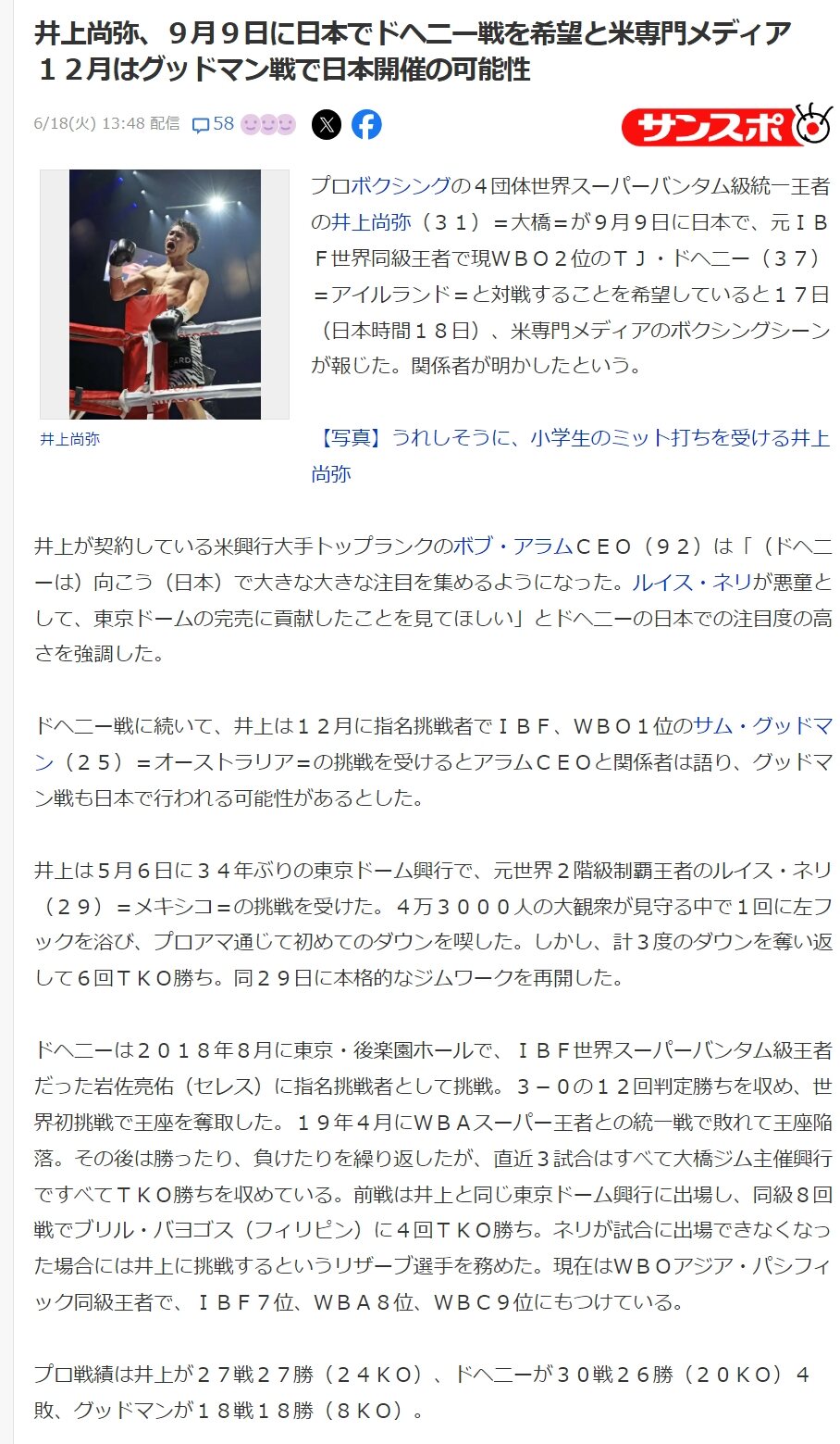 井上は6日に元世界2階級制覇王者ルイス・ネリ(メキシコ)に6回1分22秒TKO勝ち。34年ぶりの東京Dボクシング興行で初回に試合では人生初ダウンを喫しながら3度のダウンを奪い返す衝撃的な勝利を飾り、4万3000人の観衆を熱狂させていた。