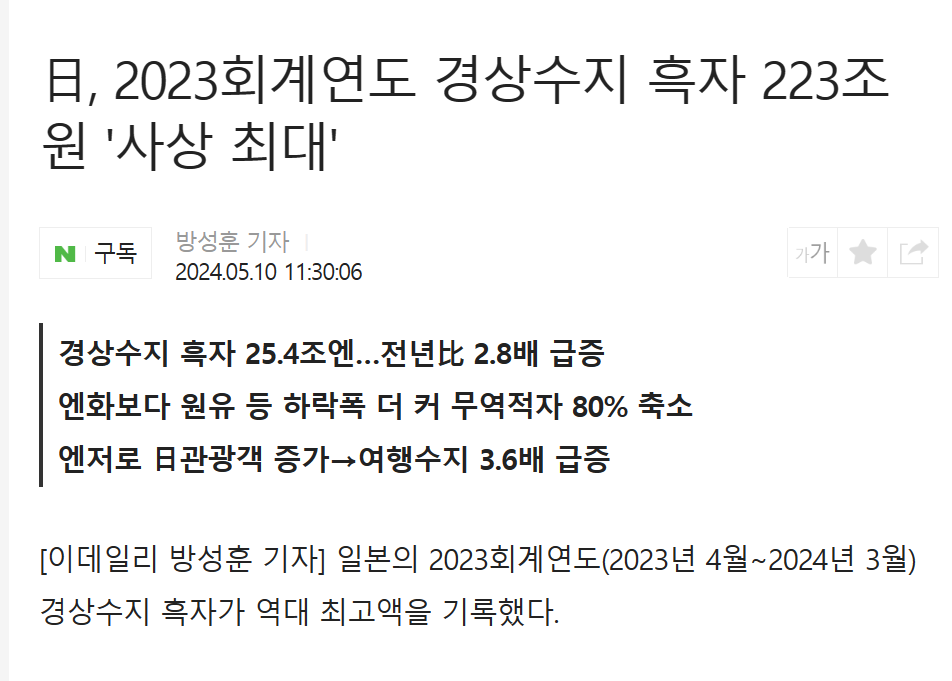 日, 2023회계연도 경상수지 흑자 223조원 '사상 최대'