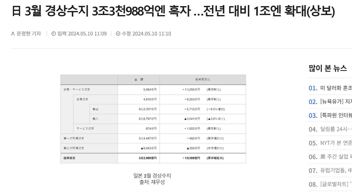 日, 3월 경상수지 3조3천988억엔 흑자 …전년 대비 1조엔 확대(상보)