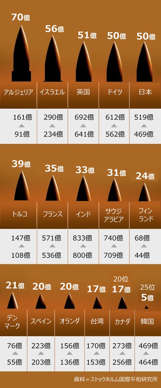 今年11月に行われる米国大統領選挙の共和党大統領選ランナー、ドナルド・トランプ前大統領が「韓国や北大西洋条約機構(NATO)など同盟に対する軍事支援まで減らすこともあり得る」と脅しをかけていることから、軍備増強の出血競争は熾烈(しれつ)になる様相を見せている。フィンランド・スウェーデンはロシアが2022年にウクライナを侵攻したことを受け、中立国としての長い伝統を捨てて軍事同盟NATOに加盟し、その後は軍備支出を増やしている。アフリカや中南米の一部の国は、内戦が起きた余波で軍事関連の支出が大幅に増えた。英国のトビアス・エルウッド議員(保守党)は最近、「ポリティコ」誌のインタビューで「世界は(第2次世界大戦直前の)1937年と似ているという印象がある」と語った。