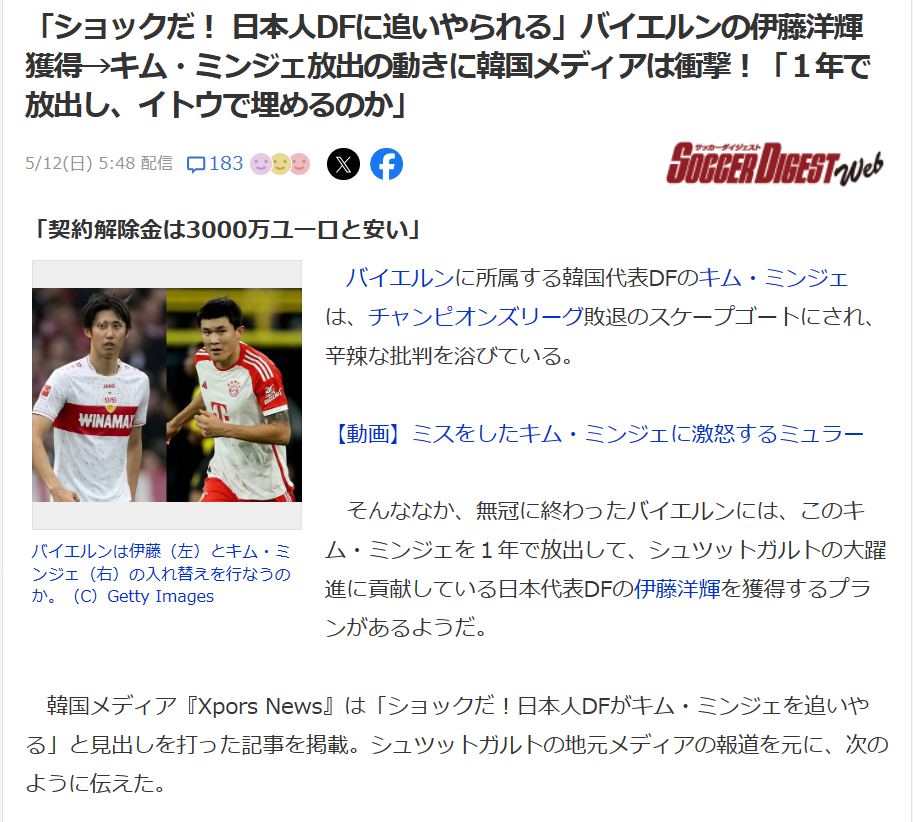同メディアは「イトウはCBだけでなく左SBもこなせるマルチプレーヤーだ。契約解除金は3000万ユーロと安く、バイエルンが全額を支払って連れてくるという計画だと見られる」と報道。シュトゥットガルのト地元メディアが「バイエルンは、いいCBは2人だけで不足している。キム・ミンジェや(ダヨ・)ウパメカノは高い移籍金にもかかわらず、活躍が不足していると伝えた」と続けている。