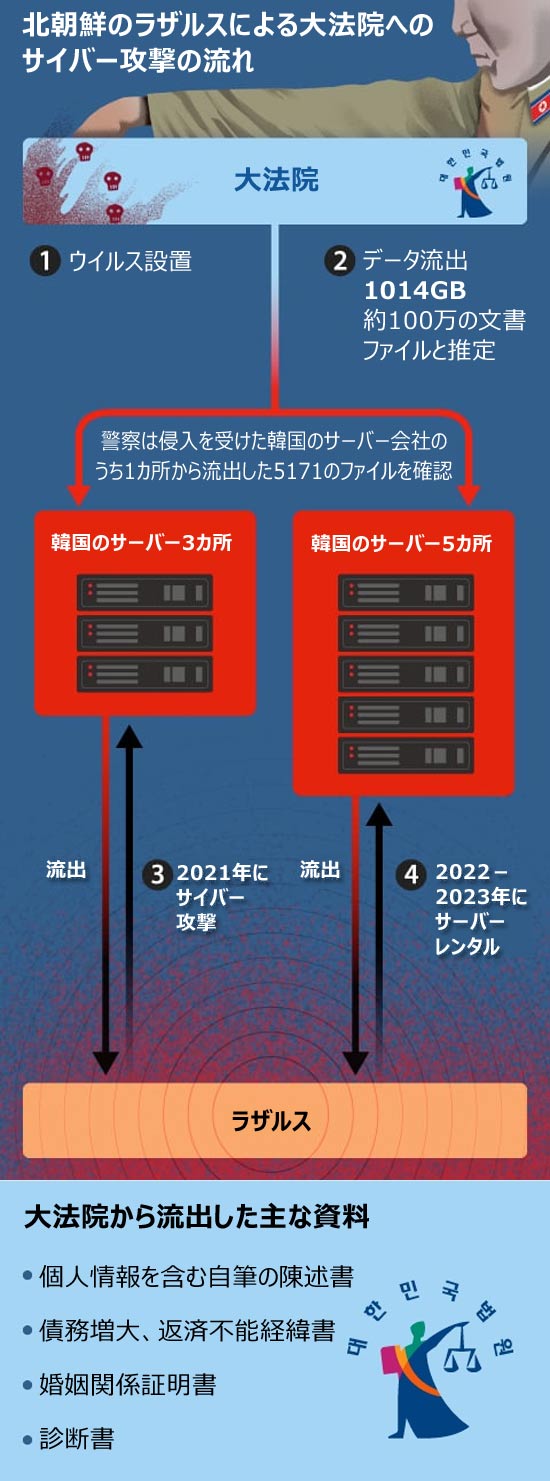 警察庁国家捜査本部、国家情報院、検察庁は同日、昨年摘発された裁判所ネットワークへのサイバー攻撃について、北朝鮮のハッカー集団「ラザルス」による犯行との結論を下した。ラザルスは北朝鮮の対南工作を総括する偵察総局に所属している。