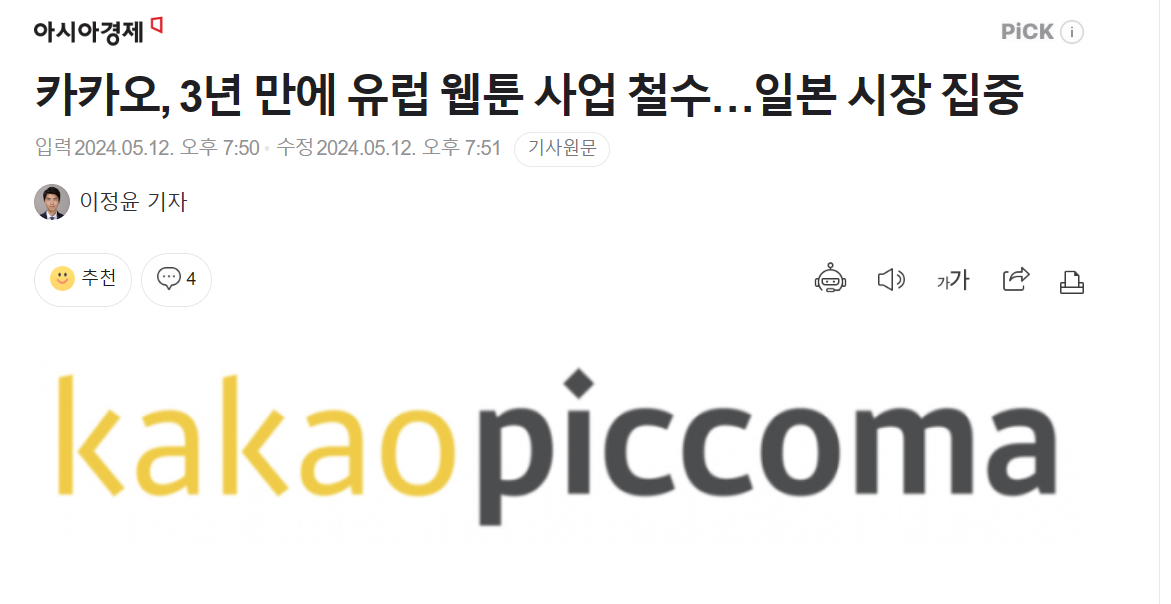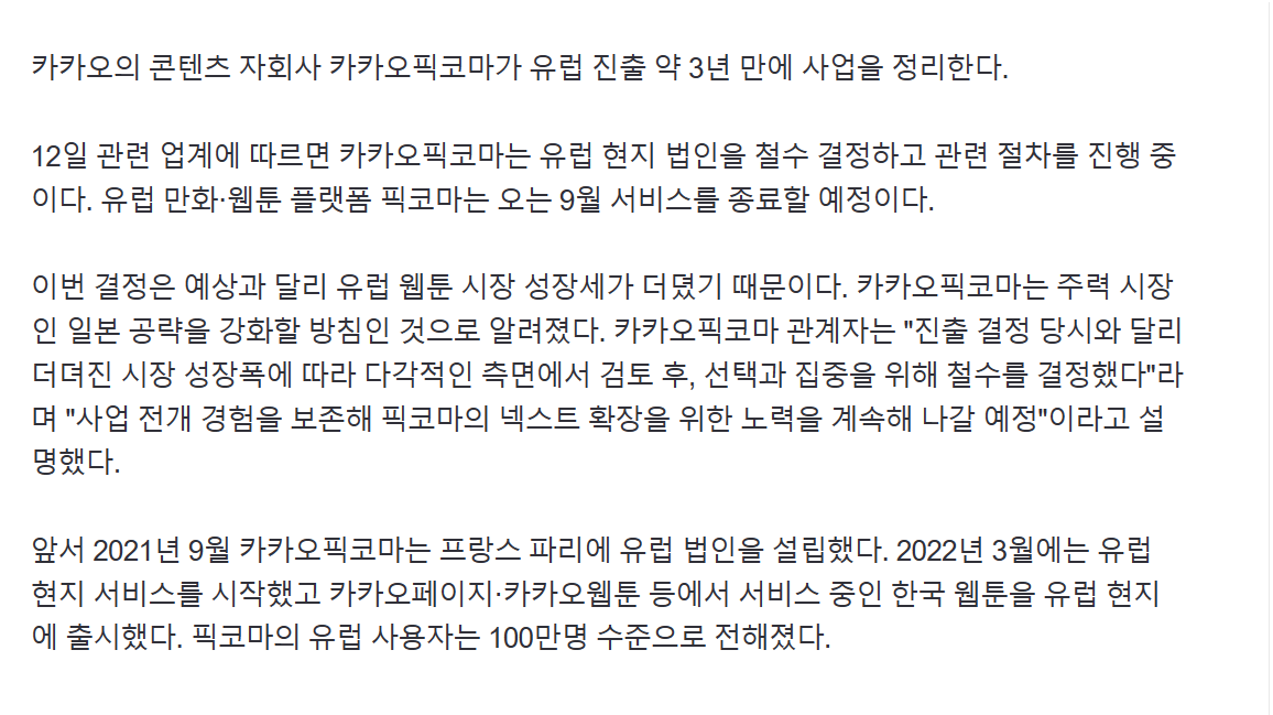 [ファイナンシャルニュース]カカオのコンテンツ子会社カカオピックコマがヨーロッパ事業をまとめる。 欧州に進出してから約3年ぶりに事業を折りたたむことで、フランスを含む欧州ウェブトゥーン市場の成長傾向が予想以上に遅れたことによる決定で解決される。