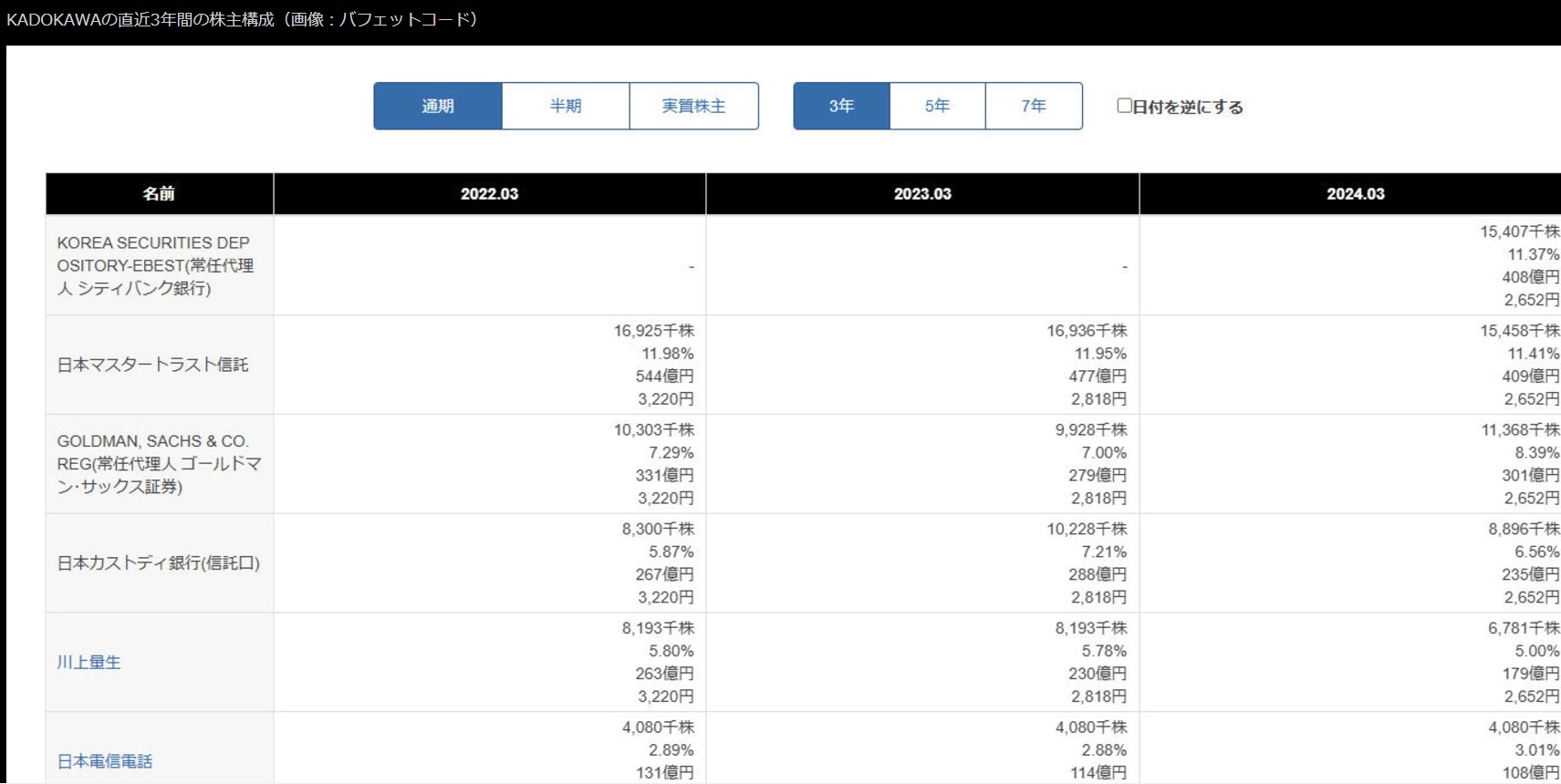 画像 KADOKAWAの直近3年間の株主構成
