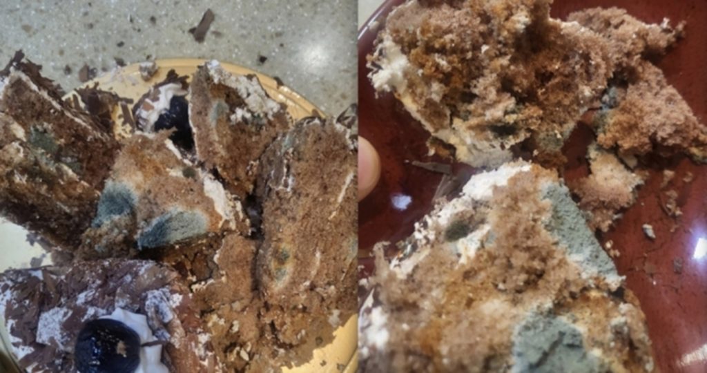 自宅でケーキを食べていた著者は味がおかしいことに気付いた。ケーキの内部を見ると暗い緑色のカビが生えていた。写真を見るとカビは全体にまんべんなく広がっている。