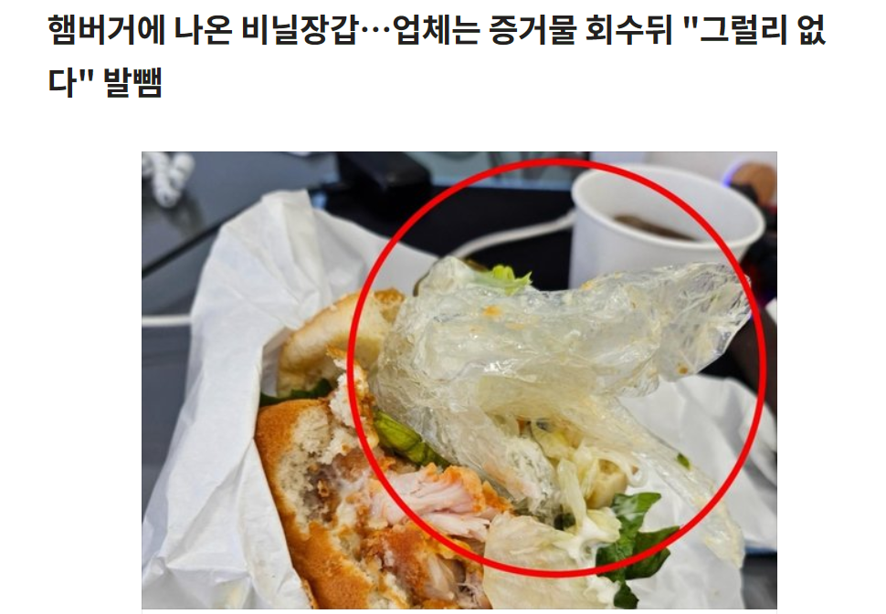 韓国ハンバーガーチェーン「マムズタッチ(Mom's Touch)」製品からビニール手袋が出てきた。会社側は証拠物を回収した後に立場を変えて、メディア取材が始まると嘘までついていたことが発覚した。