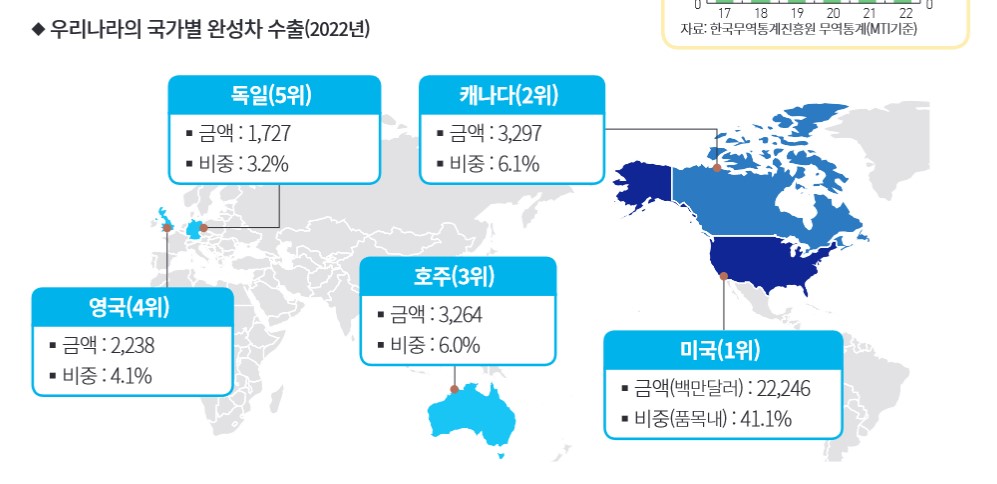 輸出を始めた2014年には622台にすぎなかったが、19年に1万台を突破し21年には1万9820台と2万台目前に迫った。この時も米国が占める割合はまだ10%台だったが、22年には6万8923台となり、31.1%に拡大した。昨年は12万1876台を輸出し、過去最大となる35.1%となった。