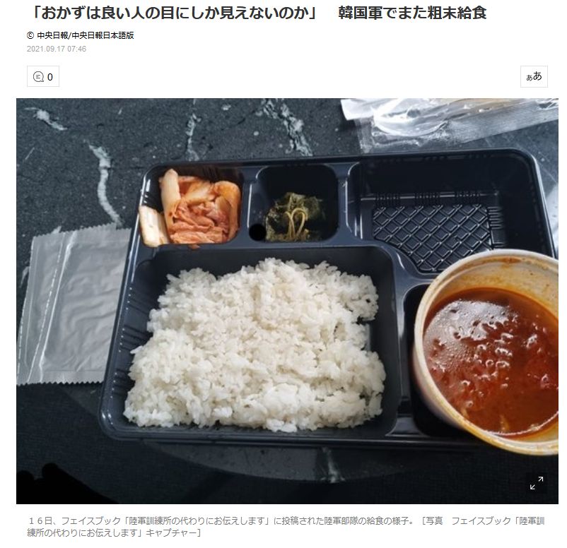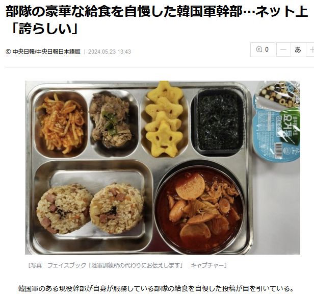韓国軍のある現役幹部が自身が服務している部隊の給食を自慢した投稿が目を引いている。