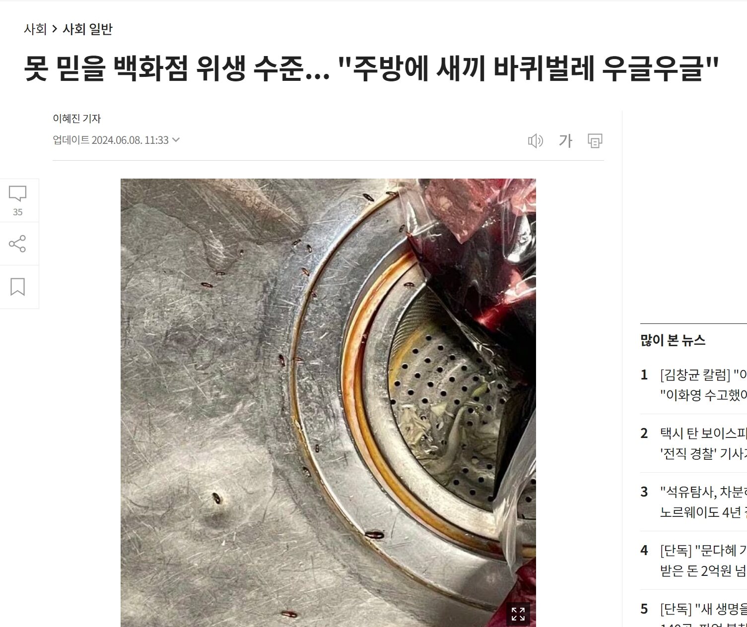 사진을 보면 싱크대 배수구에 포장에 쌓인 식재료가 놓여있었는데, 싱크대 곳곳에는 새끼 바퀴벌레로 추정되는 벌레가 여러 마리 있었다. A씨는 “크기도 가지각색이고 냉장고 안까지 구석구석 없는 곳이 없더라”라며 “제가 봤을 땐 이미 사진 속 백화점 전체에 바퀴벌레가 있을 거라 생각한다”고 했다. 그는 사진이 더 있지만 1장만 올린다고 덧붙였다. 이 매장은 구충·방제 서비스 업체를 쓰고 있는 것으로 알려졌다.