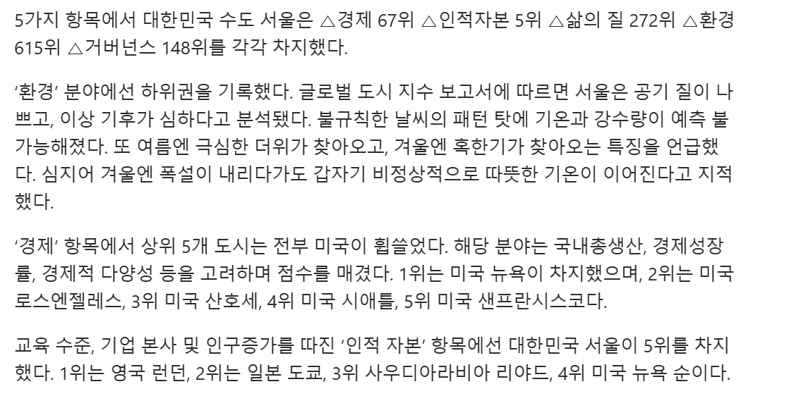 5項目で大韓民国の首都ソウルは△経済67位△人的資本5位△生活の質272位△環境615位△ガバナンス148位をそれぞれ占めた。