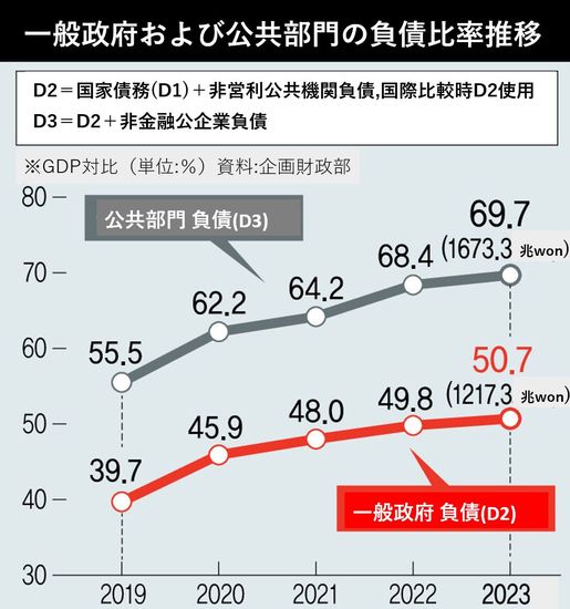 一般政府債務に韓国電力・ガス公社などの非金融公企業の債務を加えた公共部門の債務(D3)は昨年1673兆3千億ウォンを記録した。1年前に比べて84兆6千億ウォン増えた。対GDP比率は69.7%。電力購入代金などで韓電と発電子会社の債務が12兆9千億ウォン増え、庶民住居など政策事業の影響で韓国土地住宅公社の債務が6兆8千億ウォン増加した影響が大きい。企画財政部のキム・ワンス財政健全性課長は「新型コロナの対応過程で対GDP比債務比率が大きく上がったが、2021年からは債務比率の増加幅は鈍化している流れ」だと述べた。
