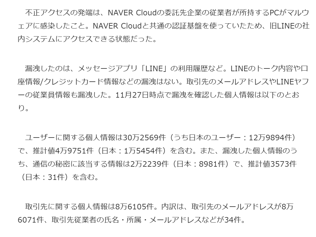 LINEヤフーは2023年11月27日、メッセージアプリ「LINE」の利用履歴や取引先メールアドレスなど44万件超(推計値を含む)の個人情報が漏洩したと発表した。同年10月9日、関係会社である韓国NAVER Cloudのシステムを介して第三者による不正アクセスを受けて情報が漏洩した。NAVER Cloudの委託先企業のPCがマルウェアに感染したことが発端と説明している。