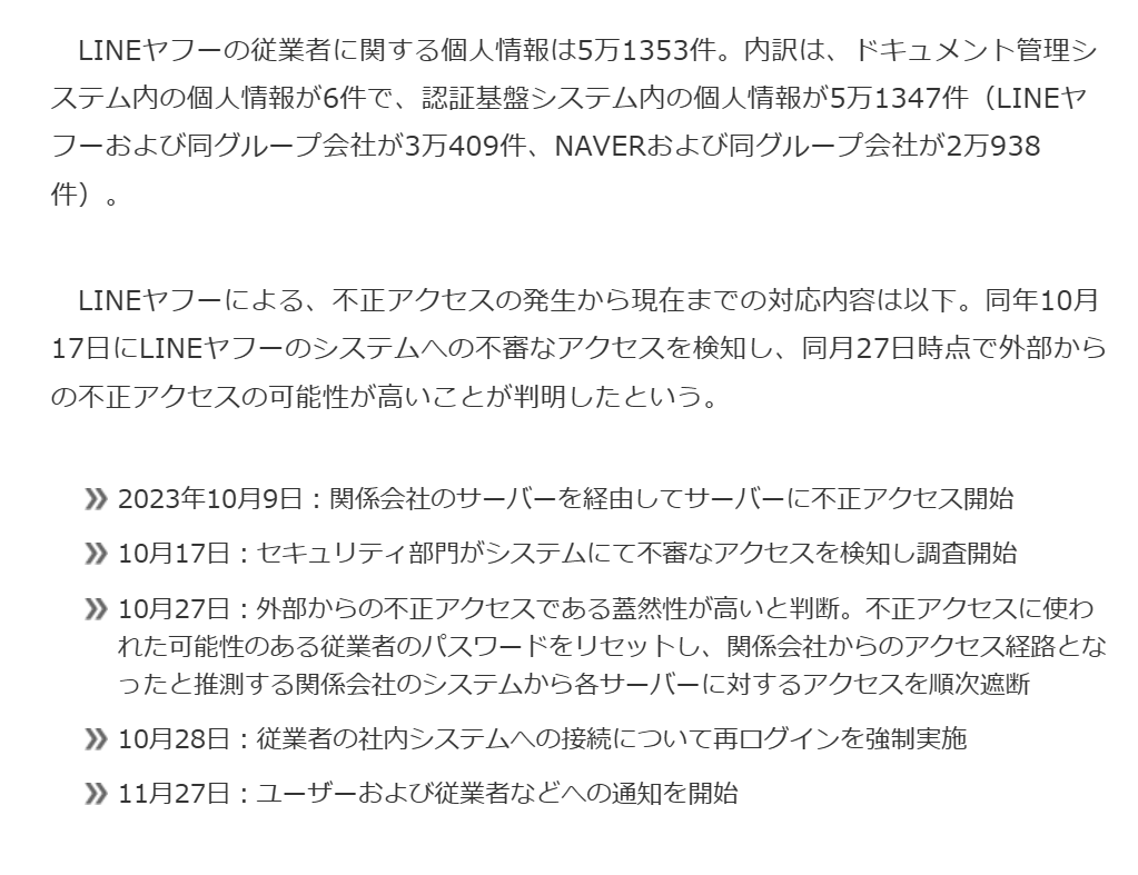 LINEヤフーで、ユーザーや取引先など44万件超の個人情報が漏洩した。2023年10月9日、関係会社である韓国NAVER Cloud(ネイバークラウド)のシステムを介して、第三者による不正アクセスを受けた。