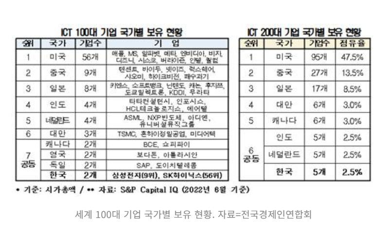 全国経済人連合会(全経連)は12日、「世界ICT企業の時価総額上位100社を選んで分析した結果、韓国は中国、日本、台湾などICT競争国にいずれも遅れを取っていることが分かった」と明らかにした。