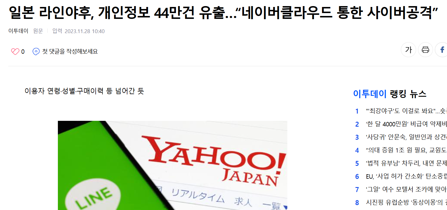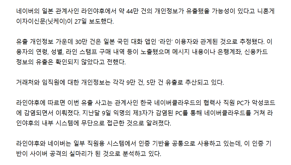 네이버의 일본 관계사인 라인야후에서 약 44만 건의 개인정보가 유출됐을 가능성이 있다고 니혼게이자이신문(닛케이)이 27일 보도했다.