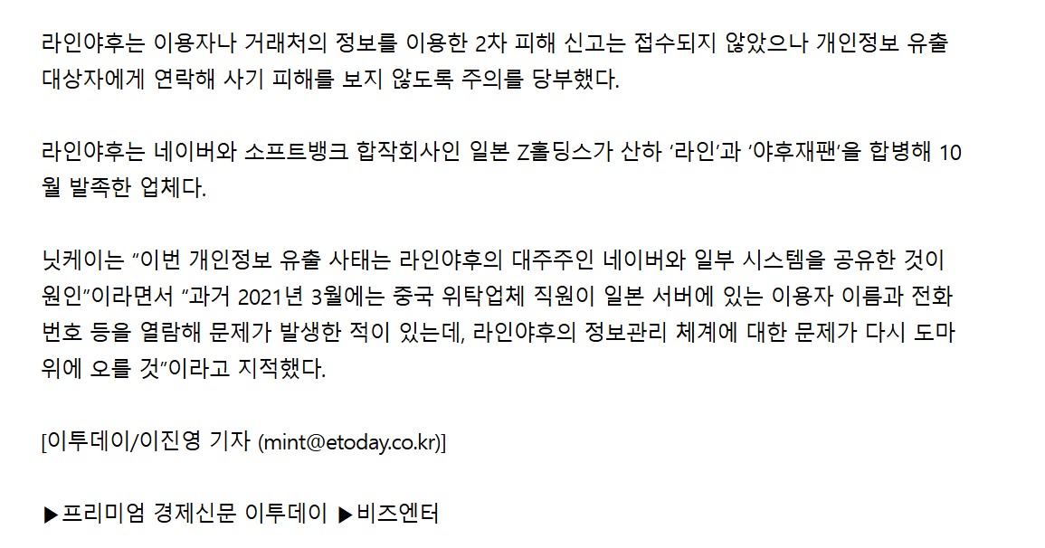닛케이는 “이번 개인정보 유출 사태는 라인야후의 대주주인 네이버와 일부 시스템을 공유한 것이 원인”이라면서 “과거 2021년 3월에는 중국 위탁업체 직원이 일본 서버에 있는 이용자 이름과 전화번호 등을 열람해 문제가 발생한 적이 있는데, 라인야후의 정보관리 체계에 대한 문제가 다시 도마 위에 오를 것”이라고 지적했다.韓国はIT軸しかないのか