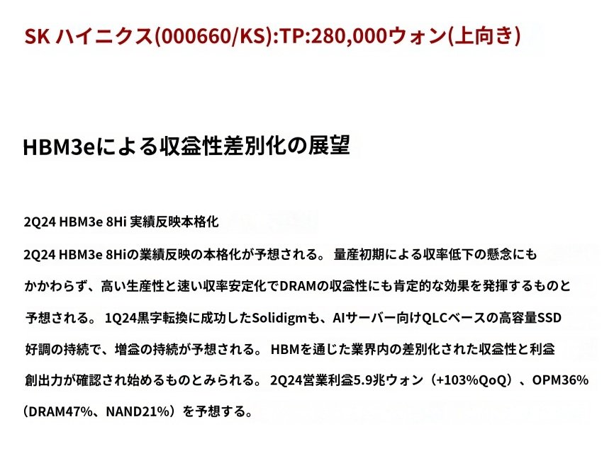 112024/05/27(Mon) 16:15:01ID:c1ODk2Nzk(1/1)NG報告今年の売上高67.8兆営業利益23.8兆ウォン(2兆7,359億円)来年の売上高81.3兆営業利益35兆ウォン(4兆234億円)再来年の売上100.4兆営業利益41.6兆ウォン(4兆7821億円)>>2>>3>>9>>15>>16>>31>>32>>33>>38>>460