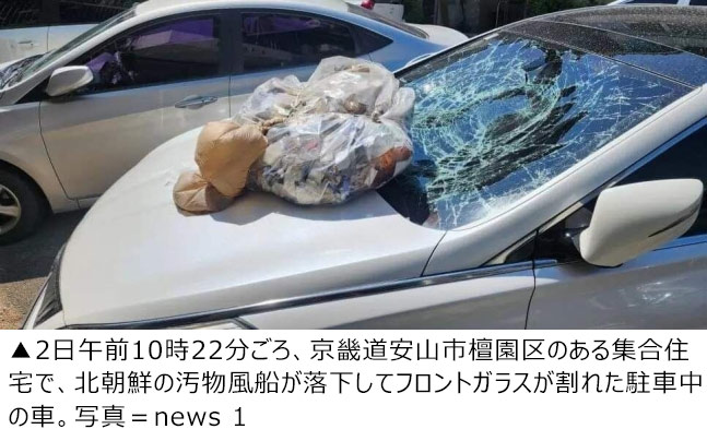 これに先立つ同日午前5時40分ごろ、ソウル市陽川区新亭洞では、駐車中のスポーツタイプ多目的車(SUV)の上に汚物風船が落ち、助手席側のフロントガラスが破損した。さらに午前10時22分ごろには、京畿道安山市檀園区のある集合住宅の駐車場でも、北朝鮮から来たと推定される汚物風船が落ち、乗用車のフロントガラスが割れた。当時、車に誰も乗っておらず、通行人もいなかったため、負傷者はいなかったとのことだ。