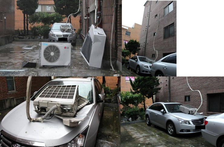 スーパーチャージャー付きの韓国車かと思ったら、上からエアコン室外機が落ちてきただけか。