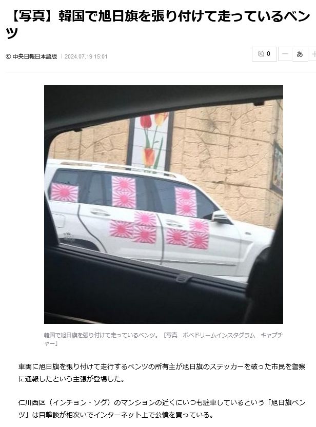 韓国で、車両に旭日旗を張り付けて走行するベンツの所有主が旭日旗のステッカーを破った市民を警察に通報したという主張が登場した。