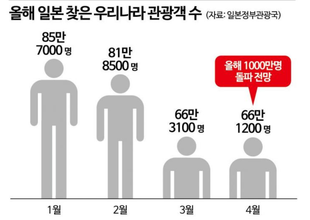 日本政府観光局(JNTO)によると、今年1~4月に日本を訪れた外国人観光客は1160万600人で、このうち韓国人は299万9800人と集計された。国・地域別で最も多く、このペースでいくと今年の訪日韓国人観光客は1000万人を突破すると予想されている。
