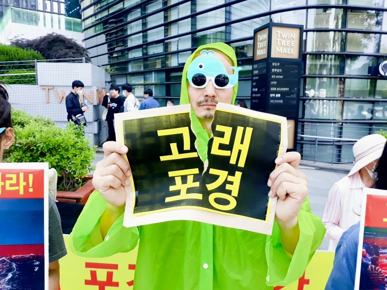 この日、団体は記者会見で声明書を朗読し、「捕鯨」と書かれた紙を破るパフォーマンスを行い、日本大使館に抗議書を伝えた。