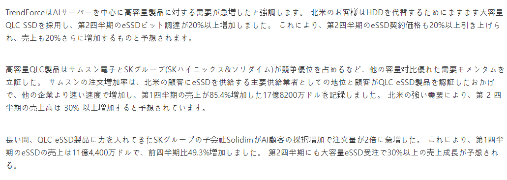 TrendForceはAIサーバーを中心に高容量製品に対する需要が急増したと強調します。 北米のお客様はHDDを代替するためにますます大容量QLC SSDを採用し、第2四半期のeSSDビット調達が20%以上増加しました。 これにより、第2四半期のeSSD契約価格も20%以上引き上げられ、売上も20%さらに増加するものと予想されます。