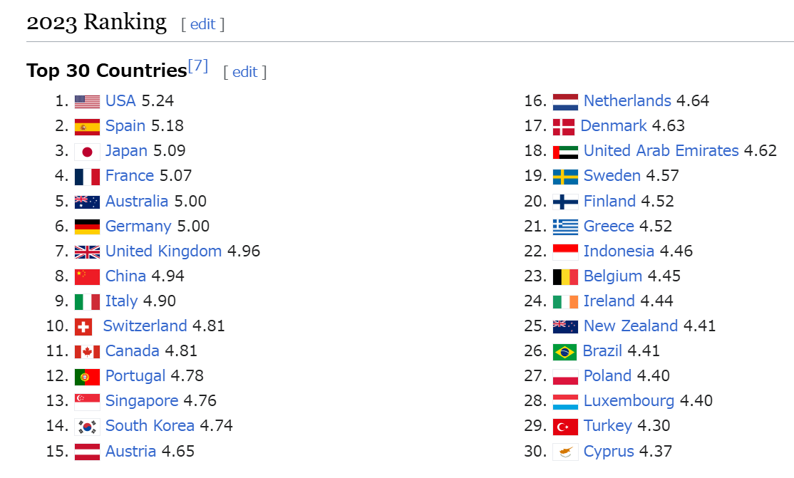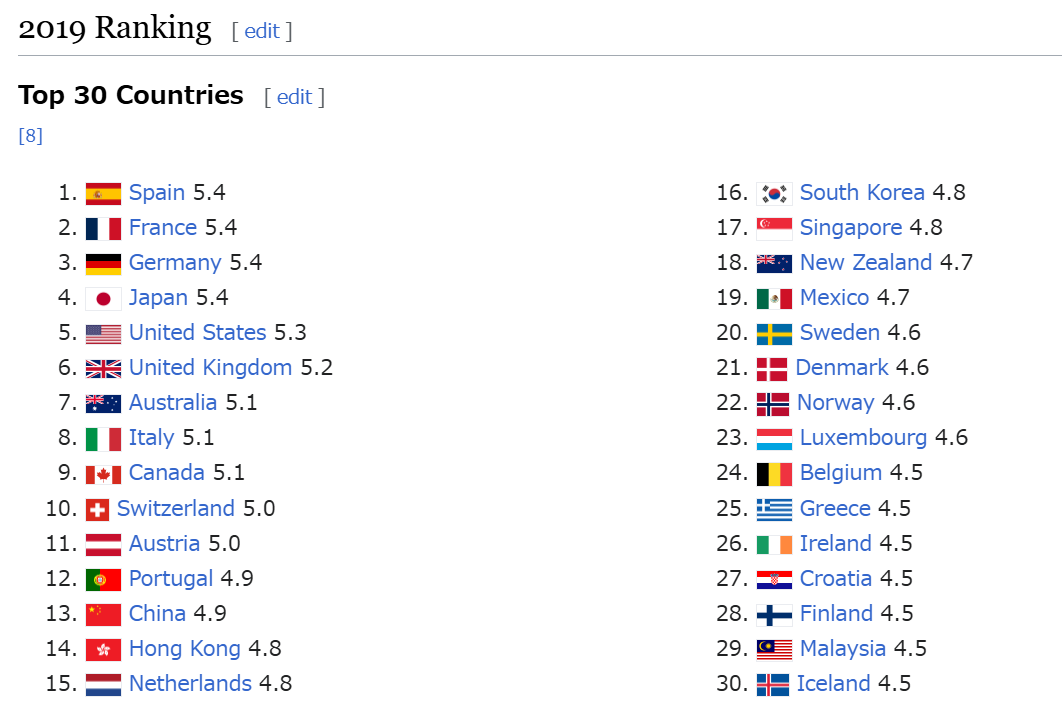 1位は米国、2位スペイン、3位日本、4位フランス、5位オーストラリア、6位ドイツ、7位英国、9位イタリア、10位スイス。