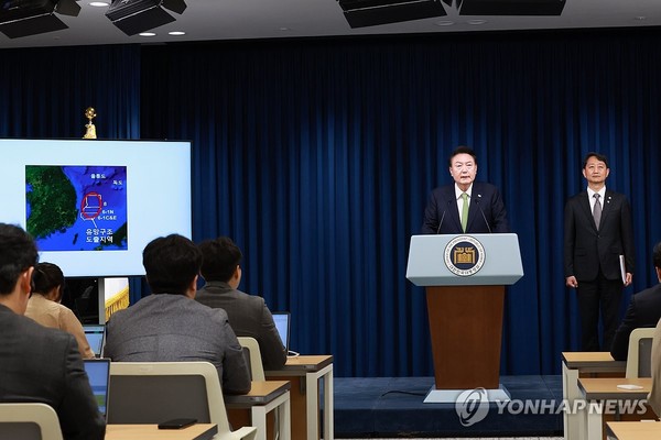 윤 대통령은 이날 서울 용산 청사 브리핑룸에서 첫번째 국정브리핑을 갖고 "포항 영일만 앞바다에서 막대한 양의 석유와 가스가 매장돼 있을 가능성이 높다는 물리탐사 결과가 나왔다"고 말했다.