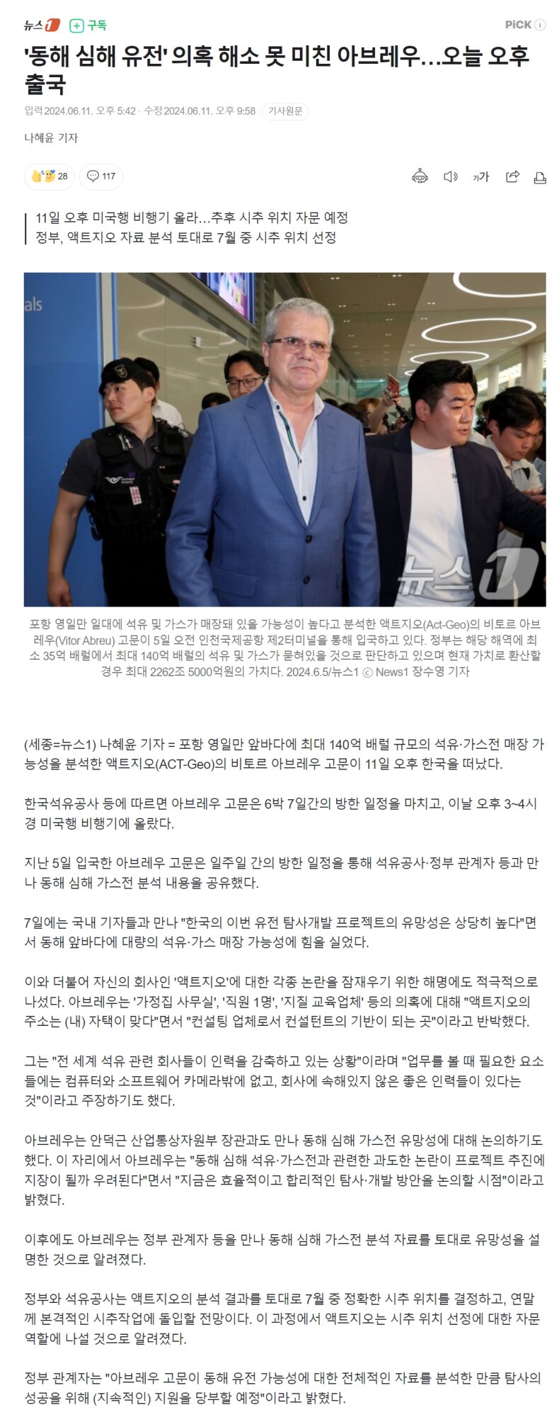동해 심해 석유·가스 매장 분석을 담당한 미국 액트지오(Act-Geo)의 비토르 아브레우(Vitor Abreu) 대표는 5일 "이번 프로젝트는 매우 중요하기 때문에 한국 국민들께 더 나은, 명확한 답변을 드리기 위해 한국을 직접 찾았다"고 말했다.