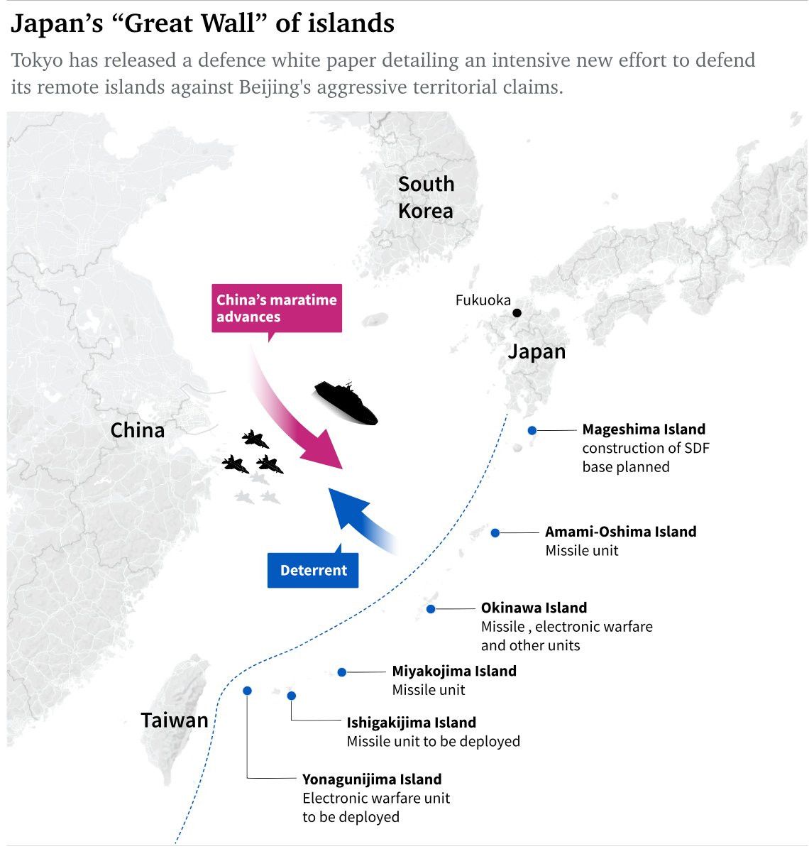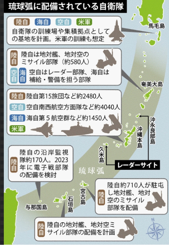 琉球弧最大の拠点は陸海空の自衛隊と米軍の基地がある沖縄本島だ。さらに第1列島線全体をカバーするため、各島に敵の巡航ミサイルや艦船に対応するミサイル部隊を配置。陸自は奄美大島、沖縄本島、宮古島に部隊を起き、石垣島でも基地の建設に着工した。