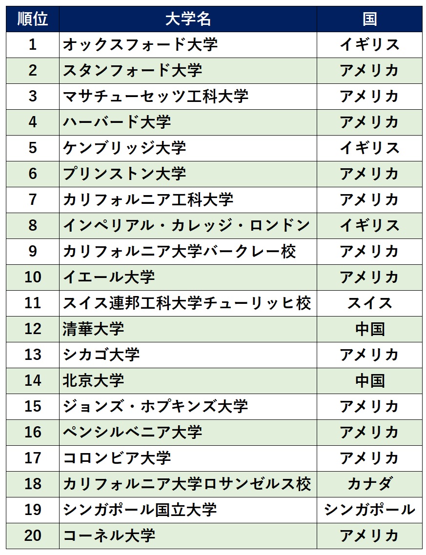 「タイムズ・ハイヤー・エデュケーション」が発表する世界大学ランキング。2024年版の結果から、1位から100位まで上位100校を掲載する。また、日本の大学からは、東京大学と京都大学がランクインし、2023年のランキングから大きく順位を上げた。