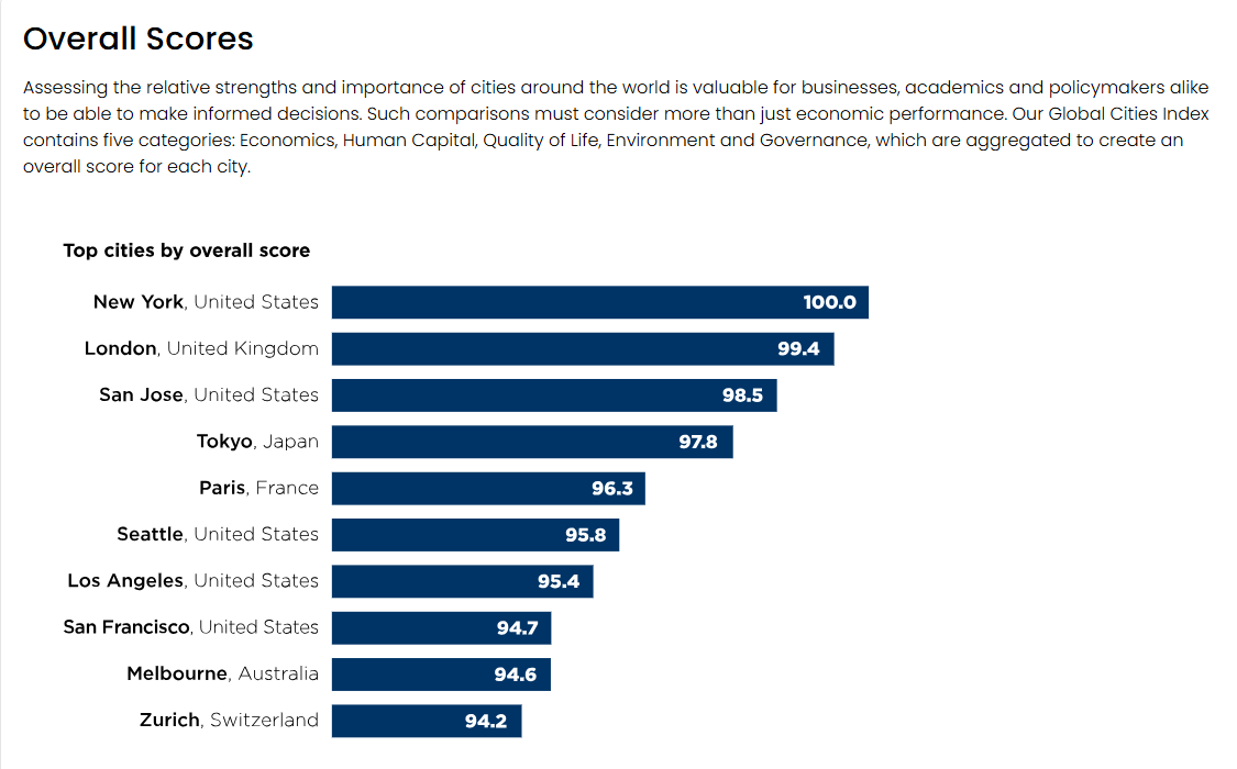 同ランキングでは、経済分野(GDP規模、成長率、経済の多様性など)、人的資本分野(教育達成度、企業本社、人口増加など)、生活の質分野(平均寿命、1人当たり所得、レクリエーション・文化施設など)、環境分野(大気の質、自然災害、気温異常など)、ガバナンス分野(制度、政治的安定、市民の自由など)の5分野・27指標で評価している。