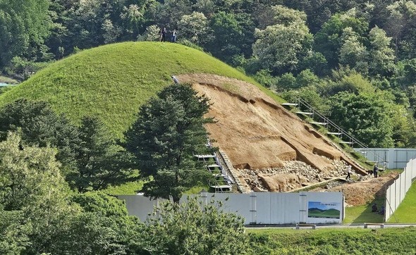 ここのところ新羅の古都・慶州が騒がしい。最近、市内の西側に位置する新羅の大型古墳の画期的な発掘の知らせが伝わり、文化財学界の台風の目として浮上した。2年前の台風ヒンナムノー(台風11号)が朝鮮半島を襲い、そのときの強風と豪雨で墳丘墓の一部が崩れた慶州西岳洞(ソアクトン)の古墳群のうち最大の王陵級の墓である4号墳で、4~5月に復旧整備のための発掘調査が行われたところ、学界の通説を覆す墓の構造が確認されたのだ。激しい論議とともに学術発掘を行う必要があるという声が噴出している。