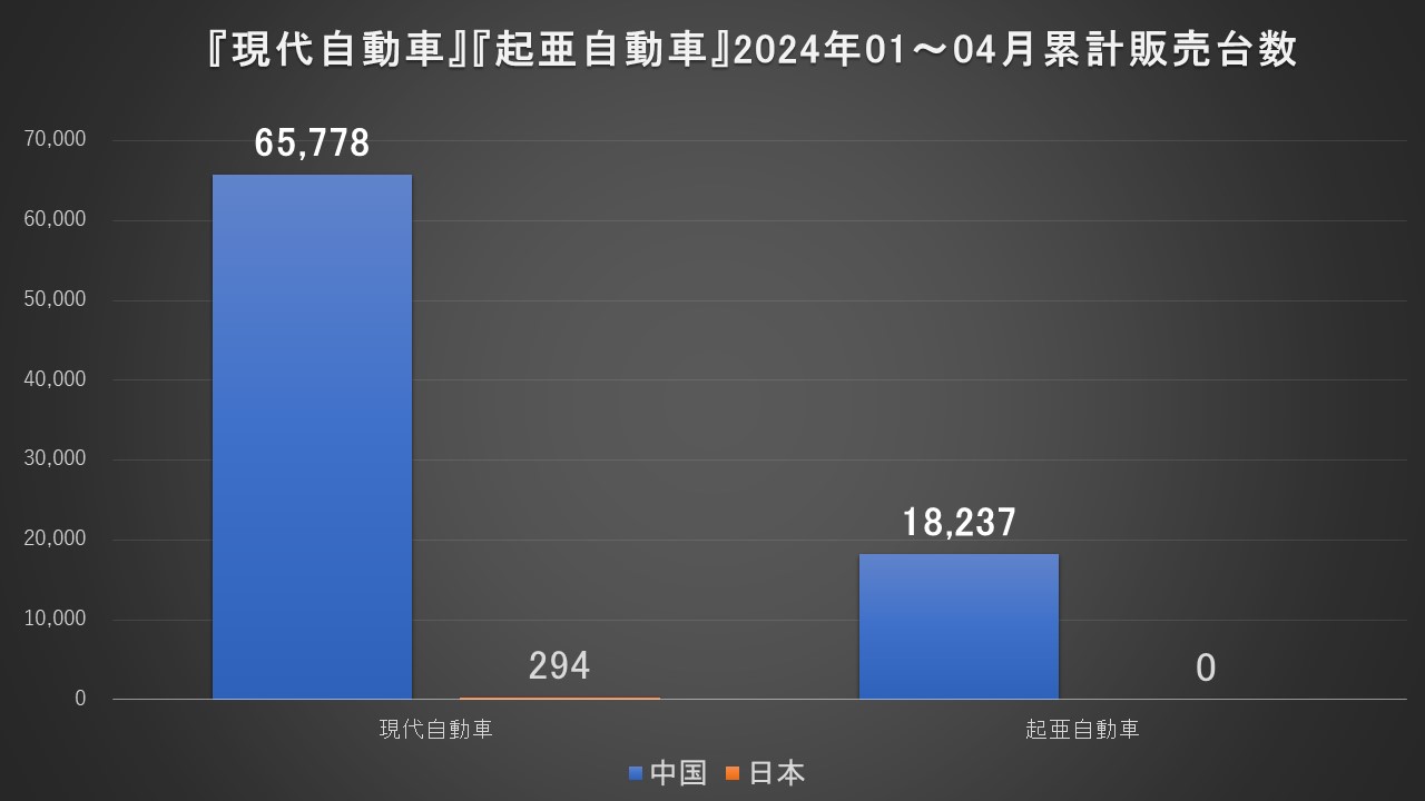 『現代自動車』『起亜自動車』で合算すると中国では「8万4,015台」、日本では「294台」となります。