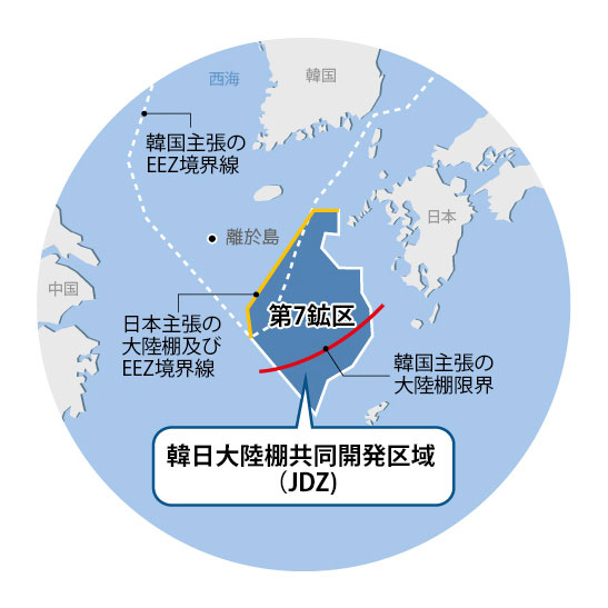 両国の大陸棚の境界を確定した韓日大陸棚協定は1974年1月に締結され78年に発効した。2028年に満了し、満了の3年前から一方が終了を通知することができる。