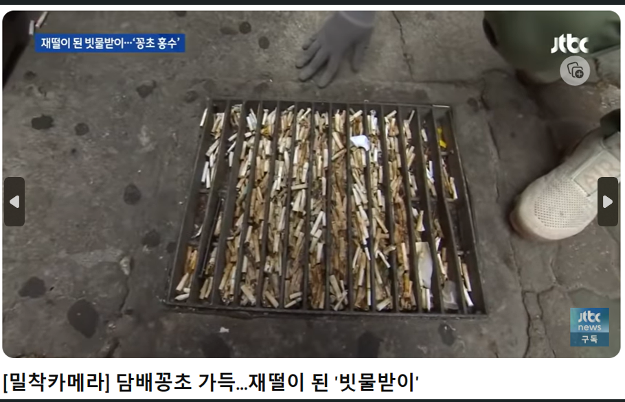 2022年夏に洪水が起きた際、ソウルでは何人もの市民が命を落とした。降水量が多かったせいもあるが、たばこの吸い殻が排水溝のゴミ受け部分に詰まったせいで被害が拡大した。ソウル市内にはおよそ55万個の排水溝用ゴミ受けがあるが、たばこの吸い殻が詰まっていて十分な役割を果たせていない。排水溝のゴミのうち70%がたばこの吸い殻だ。国立災難(災害)安全研究院によると、ゴミ受けの3分の2が詰まると浸水の高さが正常な時の2倍にもなる。これは半地下に住む世帯にとっては大きな脅威だ。「たばこのポイ捨ては市民の安全を脅かす反社会的悪習と考えるべきだ」との指摘も出ている。