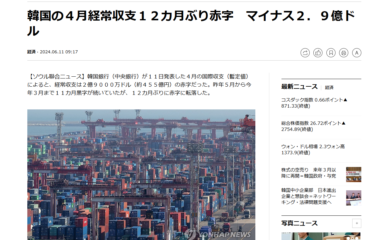 韓国の4月経常収支12カ月ぶり赤字 マイナス2.9億ドル