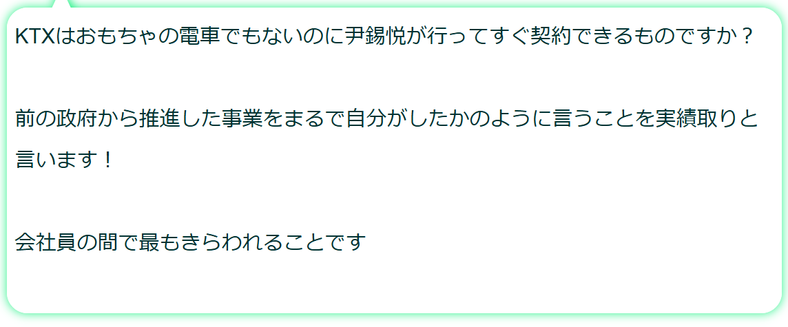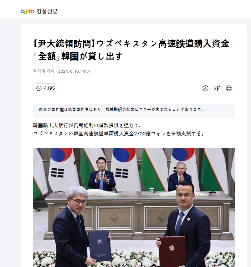 「KTXは純粋な韓国技術」という大ウソをついています。タシケントなのでバレない、とでも思ったのでしょうか。また、「世界の高速鉄道市場をノックアウトする」そうです。(略)