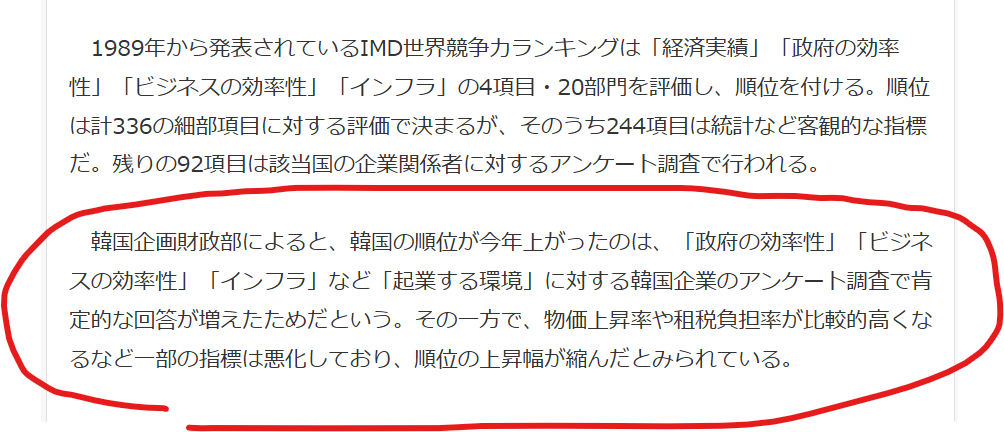 > 韓国企画財政部によると、韓国の順位が今年上がったのは、「政府の効率性」「ビジネスの効率性」「インフラ」など「起業する環境」に対する韓国企業のアンケート調査で肯定的な回答が増えたためだという。