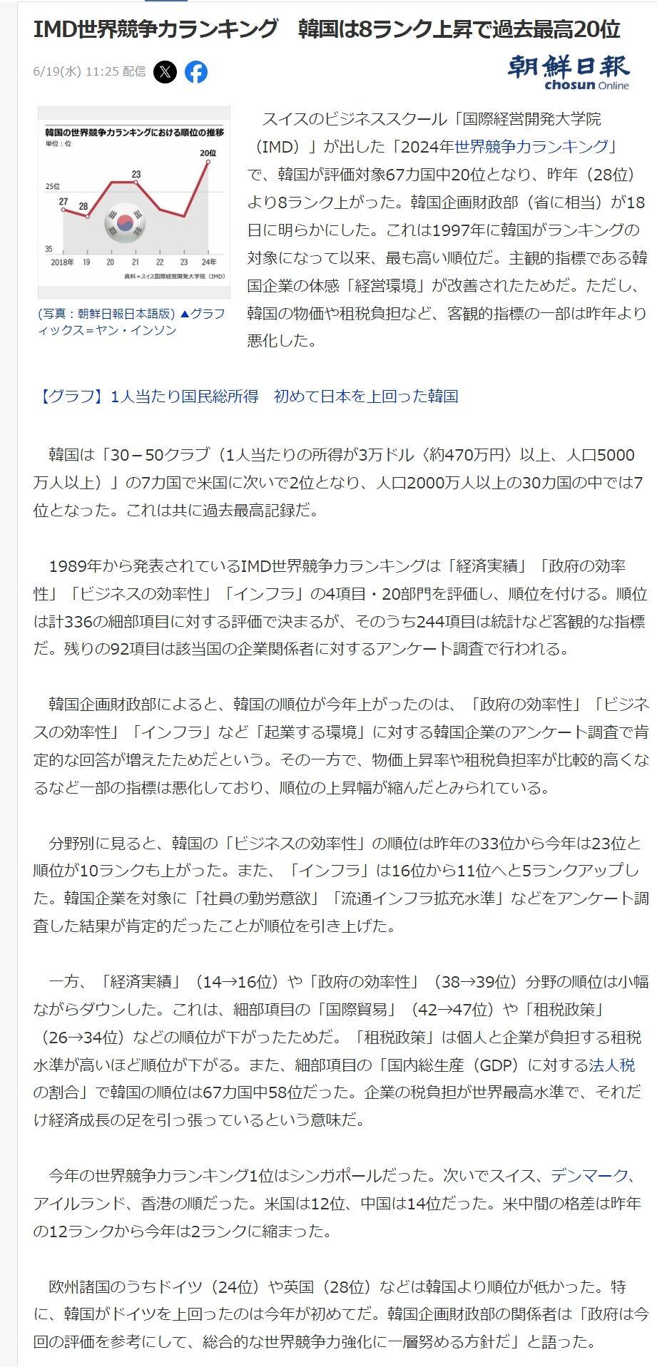 IMD는 작년·재작년 주요 통계 지표 및 설문 등을 토대로 한국의 국가경쟁력을 20위로 평가했다. 이는 작년(28위)보다 여덟 계단 오른 것으로, 1997년 한국이 평가 대상에 포함된 이래 가장 높은 순위다. 한국은 '30-50 클럽'(1인당 소득 3만달러 이상, 인구 5천만명 이상) 7개국 가운데 미국에 이어 2위를 했고, 인구 2천만명 이상 30개국 가운데선 7위를 기록했다. 이 둘 역시 사상 최고 기록이다.